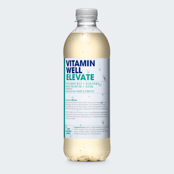 Vitamin Well Elevate innehåller vitamin B12, folsyra och magnesium som alla bidrar till att minska trötthet och utmattning. Elevate innehåller även zink som bidrar till immunsystemets normala funktion. Dessutom bidrar magnesium till normal muskelfunktion.