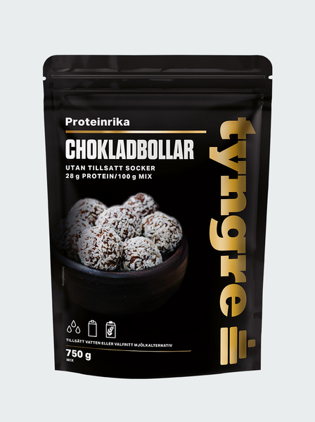 Sju sorters kakor är en trevlig svensk tradition, men ärligt talat: De där små torra kakorna kändes ganska fattiga så fort chokladbollen gjorde entré på fikascenen. Ända sedan den dagen har svenskt fika kommit att domineras av denna himmelska boll – vem hade kunnat ana att kakao, smör, havre och kokos kunde skapa sådan ljuvlig smakpoesi? Det har egentligen bara funnits ett problem: Bollarna har inte alltid gått rätt ut i biceps på det viset man skulle kunna önska. Fram till nu. Med tyngres nya chokladbollsmix är det inte bara enklare och snabbare än någonsin att göra delikata chokladbollar: De här bollarna är dessutom packade med protein och helt utan tillsatt socker! Det är nästan som ett trolleritrick hur chokladbollar som man bara rör ihop med vatten på en minut kan bli så goda, men tro oss: De här levererar en smaksensation i varje boll! En härlig sötma, en rik chokladsmak och en liten touch av både sälta och kaffe gör smakbalansen perfekt! Naturligtvis funkar de med valfri topping. Blanda, rulla och njut – dina smaklökar och muskler kommer att tacka dig!