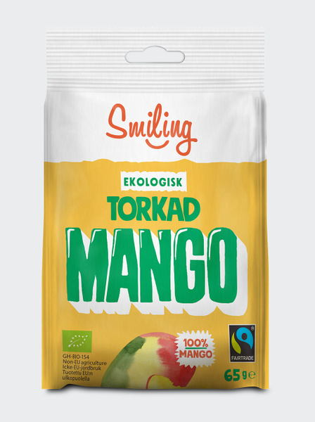Smiling Torkad Mango är enkelt, naturligt och fantastiskt gott! Smilings mango kommer från Burkina Faso och från Ghana. Vid skördetid ligger mangodoften som ett sött täcke över hela byn. Mangon plockas solmogen direkt från träden av bönderna för att sedan transporteras till fabriken. Här tvättas, skalas och torkas den. (Sa vi att mangon är Fairtrademärkt och ekologisk?)