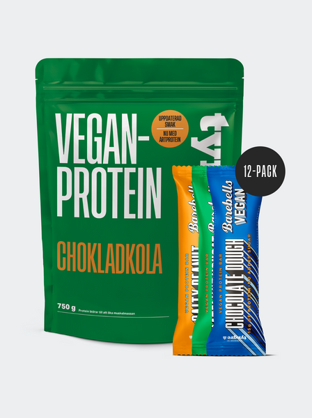 Mixa ditt eget Tyngre x Barebells - Veganpaket! Paketet innehåller vårt Veganska Protein Chokladkola samt valfri låda från Barebells sortiment av veganska proteinbars. Du väljer smak på din proteinbars i Tyngre x Barebells - Veganpaket ovan. [url="https://tyngre.se/kosttillskott/vegan" title="Veganskt Protein"]Veganskt Protein[/url] Chokladkola har troligtvis varit vår mest efterfrågade produkt någonsin – inte bara av veganer, utan av alla möjliga människor som av olika anledningar då och då vill välja bort mjölkprodukter. Problemet har varit smaken. Vi har testat mer eller mindre varenda icke-animalisk proteinkälla som existerar, utan att bli helt nöjda. Förrän nu. Barebells (https://tyngre.se/produkt-kategori/livsmedel/barebells/) Vegan Bars är en sann dröm för alla chokladälskare! Dessa proteinbars är berikade med 15 gram växtbaserat protein från soja, ärta och ris, och som vanligt kompromissar Barebells (https://tyngre.se/produkt-kategori/livsmedel/barebells/) aldrig med smaken. Vi anser nämligen att man inte ska behöva nöja sig med sämre smak bara för att en produkt råkar vara vegansk. Och nu kan vi äntligen presentera ljuvliga veganska alternativ som inte är riktigt goda för att vara veganska – utan riktigt goda helt oavsett!